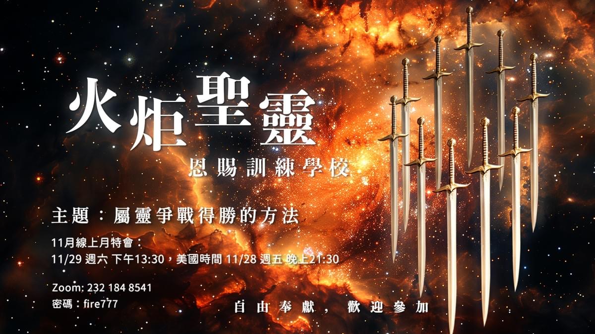 因著神的呼召,為著幫助在這末世神的衆兒女們,能在聖靈所賜的恩賜上被裝備、訓練及提升;成為在末後大有能力的屬靈將領,而創立火炬聖靈恩賜訓練學校。